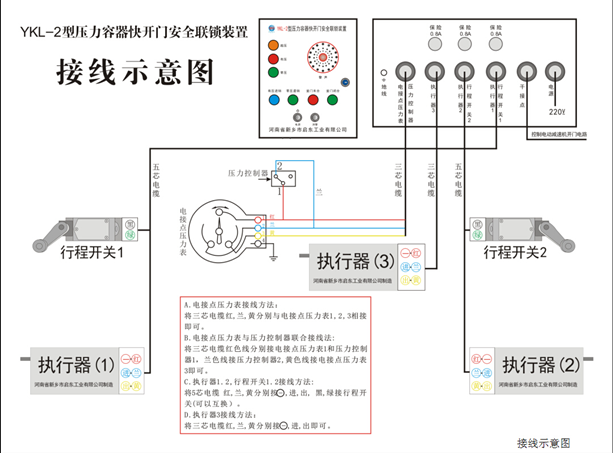 2.執(zhí)行器不防雨,220V供電設(shè)備在高溫潮濕環(huán)境中、露天下雨時,如遮蓋不及時,工作狀態(tài)可想而知······設(shè)備損壞、漏電、跳閘、觸電。對快開門壓力容器正常運(yùn)行帶來很大的安全隱患。為此我公司技術(shù)人員投入近兩年時間,進(jìn)行全面徹底的技術(shù)創(chuàng)新,終于成功研發(fā)了YKL-2型壓力容器快開門安全聯(lián)鎖裝置。