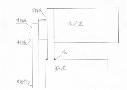2.3.1.測量容器殼體齒圈的內(nèi)齒面距密封面距離的1/2處到釜體斷面的實(shí)際尺寸,在齒圈外壁上畫安全銷縱中心線。