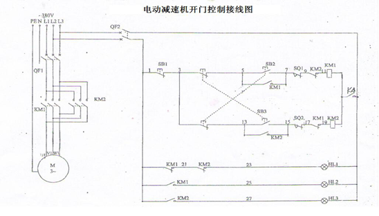 將主控箱輸出的常開干接點(diǎn)K4串入電動(dòng)減速機(jī)電路,如下圖: